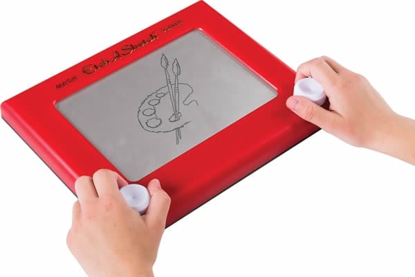 Which toy allowed you to create designs by turning two knobs to control a stylus?