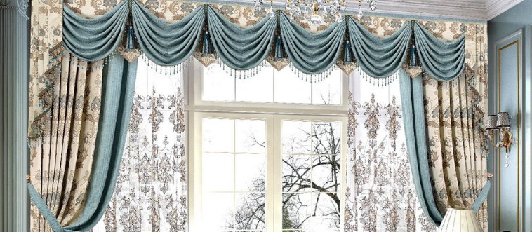 Which window treatment features elegant, flowing fabric draped with graceful swags on top for a romantic touch?